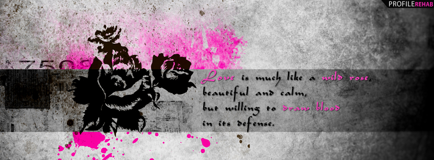 Creative love quote facebook banner, Download Free Roses quotes facebook cover pictures, Grunge Pink and black roses fb profile covers, Love is much like a wild rose, beautiful and calm, but willing to draw blood in its defense saying quote cover, Mark Overby quote design for fb