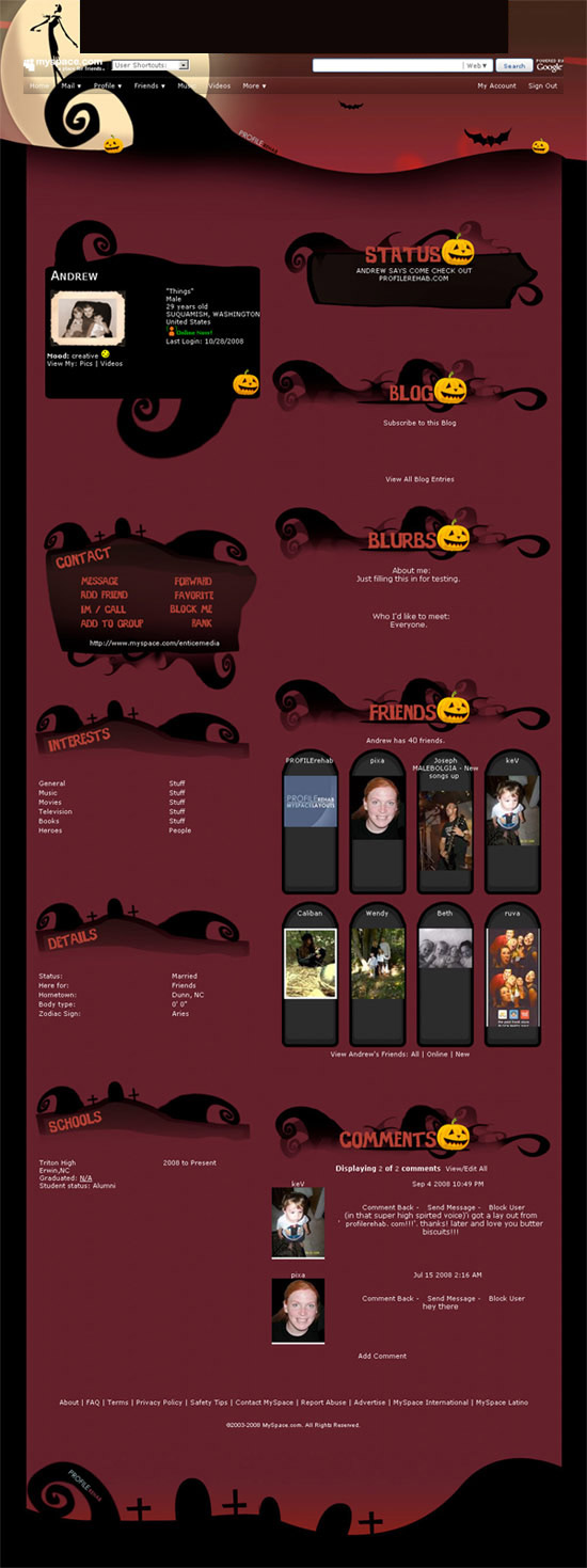 Notice: Undefined variable: page_title in /home/profilerehab/public_html/includes/page.alternate_preview.php on line 3 Nightmare Before Christmas Layout - Halloween Myspace Layout