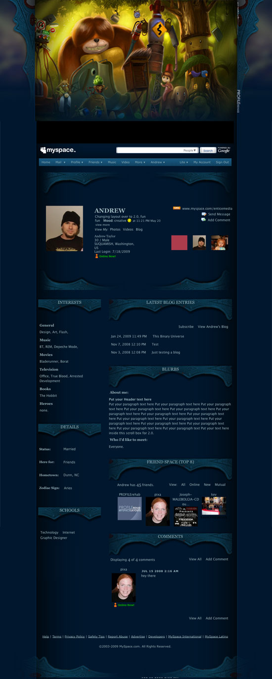 Free Artistic Animal Layouts, New Dog Drawing Myspace Layouts, Free Blue & Black Artsy Layout for Myspace 2.0, Guy Artistic Theme for Myspace, Cool Black & Blue Myspace Themes, Pretty Animal Design, Artistic Myspace 2.0 Layout with Animals, Best Art Theme, Unique Scenic Drawings Layout, CG Illustration Myspace Layout