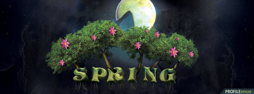 Artistic spring cover photo with spring quote, Cool spring facebook cover with moon, spring fb covers with trees growing out of the Word Spring